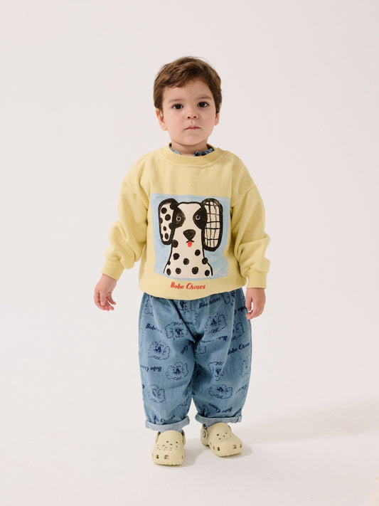pickles the dog all over denim pants