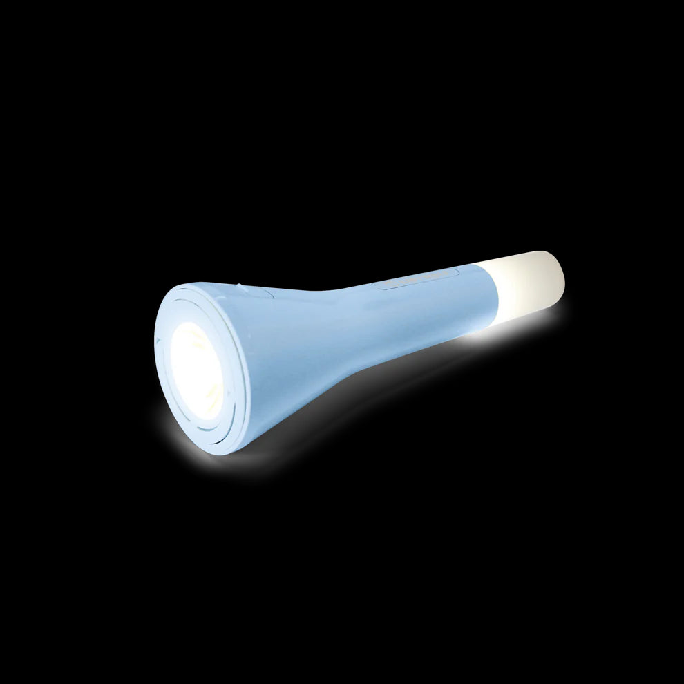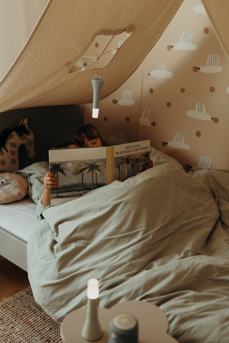 Met zijn drie functies kan KIDYFLASHLIGHT gebruikt worden als zaklamp, worden neergezet om een zachte sfeer te creëren of worden opgehangen dankzij de geïntegreerde ring. Het warme, dimbare licht is perfect om een rustgevende sfeer te creëren.