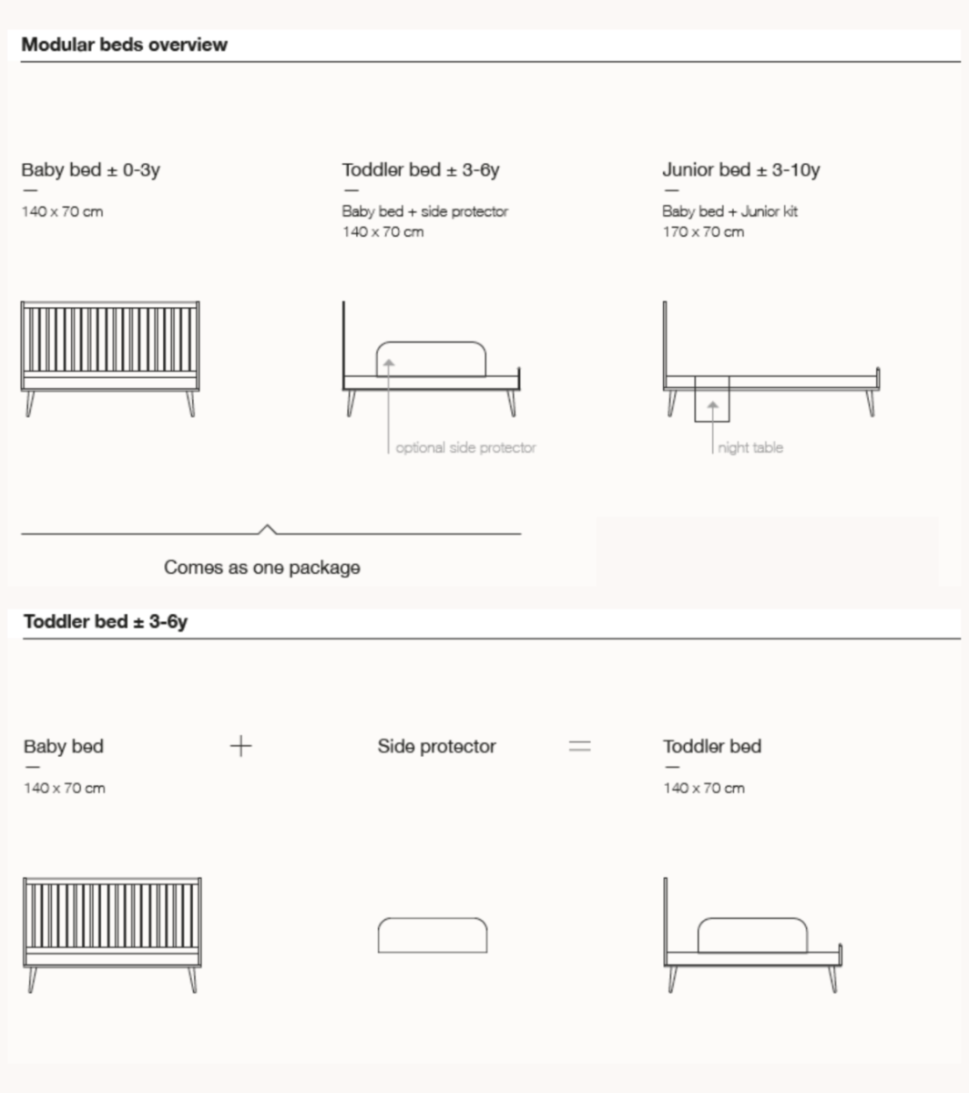 Het Ashi Bed transformeert naadloos naar een open peuterbedje, zonder dat er extra stukken nodig zijn. Voor extra veiligheid kun je een optionele uitvalbeschermer toevoegen wanneer het bed is omgebouwd tot een open bedje (art. 54FD-01-0XX). De magie stopt hier niet: met de Junior Kit (art. 54F05-01XLEK00X) kun je dit bed omvormen tot een junior bed van 170 x 70 cm, waardoor het een trouwe metgezel is op de reis van je kind naar zelfstandigheid, tot de leeftijd van 10 jaar. Dit maakt het ook een duurzame keuze.