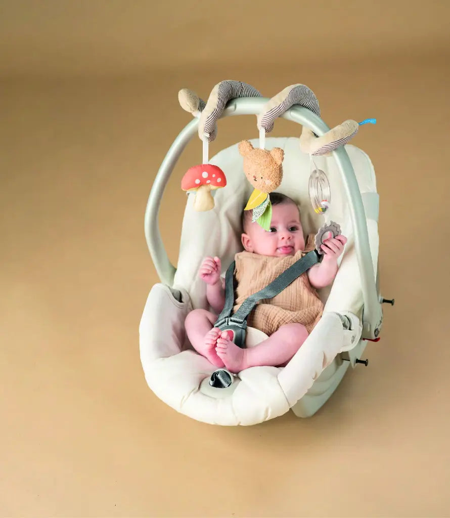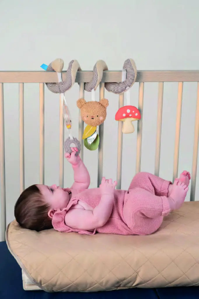 De Bear Hug Spiral is ontworpen om je kleintje onderweg bezig te houden en bevat een zacht beertje, een schattige paddenstoel en kleurrijke bijtringen en kralenringen - allemaal geïntegreerd in een spiraalvorm die makkelijk aan de kinderwagen, buggy of autostoel kan worden bevestigd.