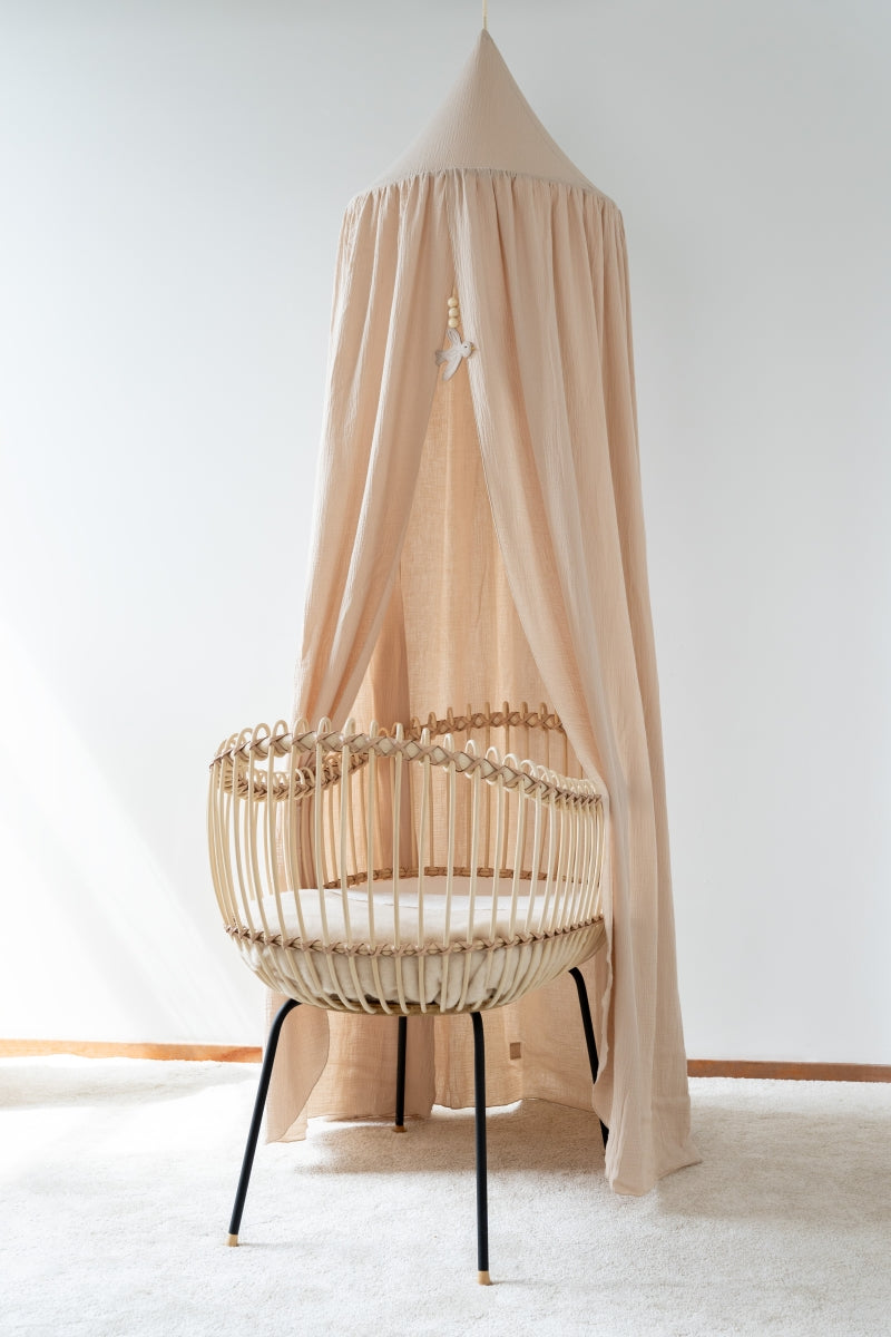 De mooie Nanami bedhemel is 1.80 m hoog en heeft romdom ruim 3,5 meter stof. De stof is van de mooie katoen mouseline in bio latte kleur.