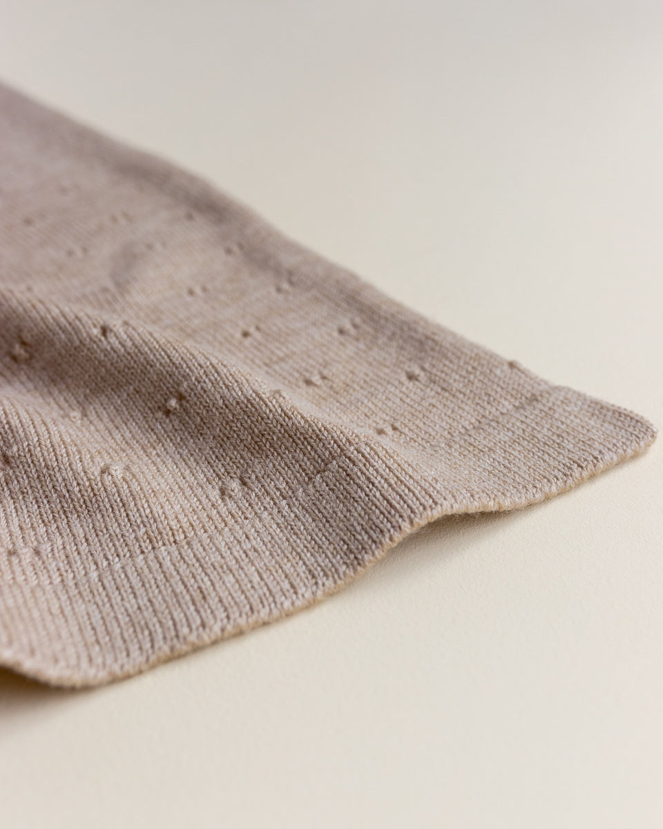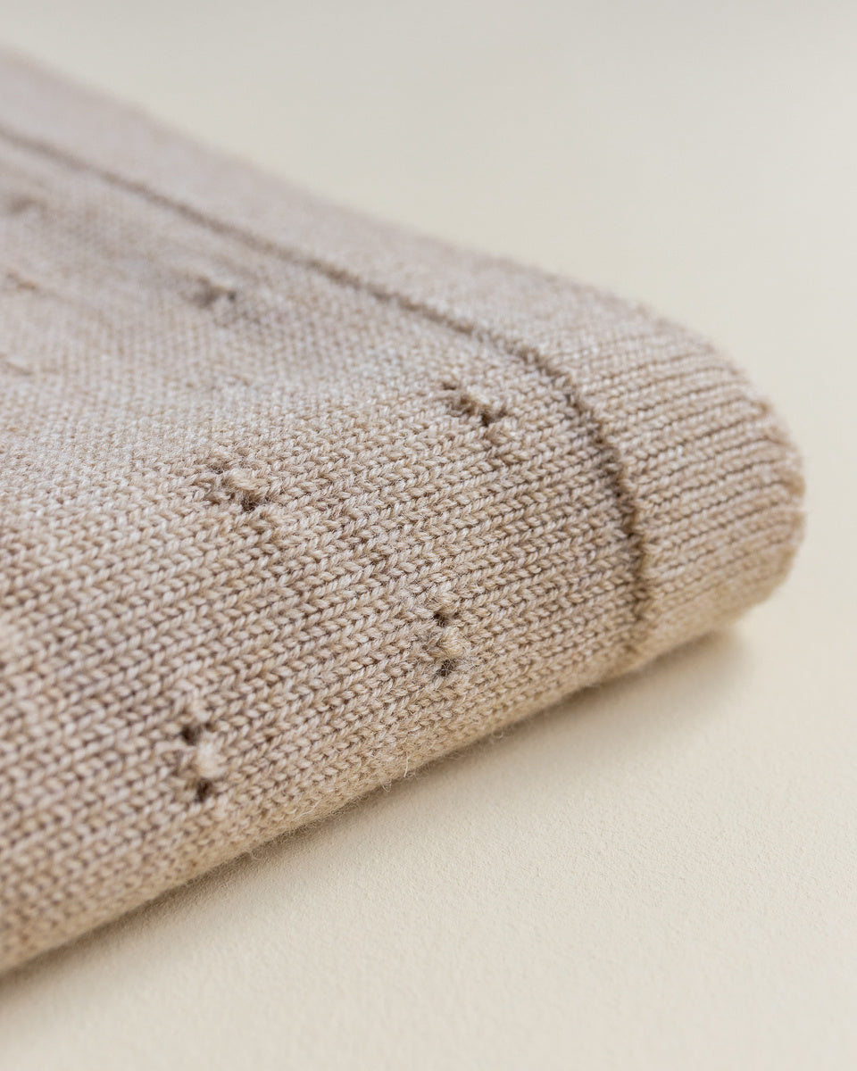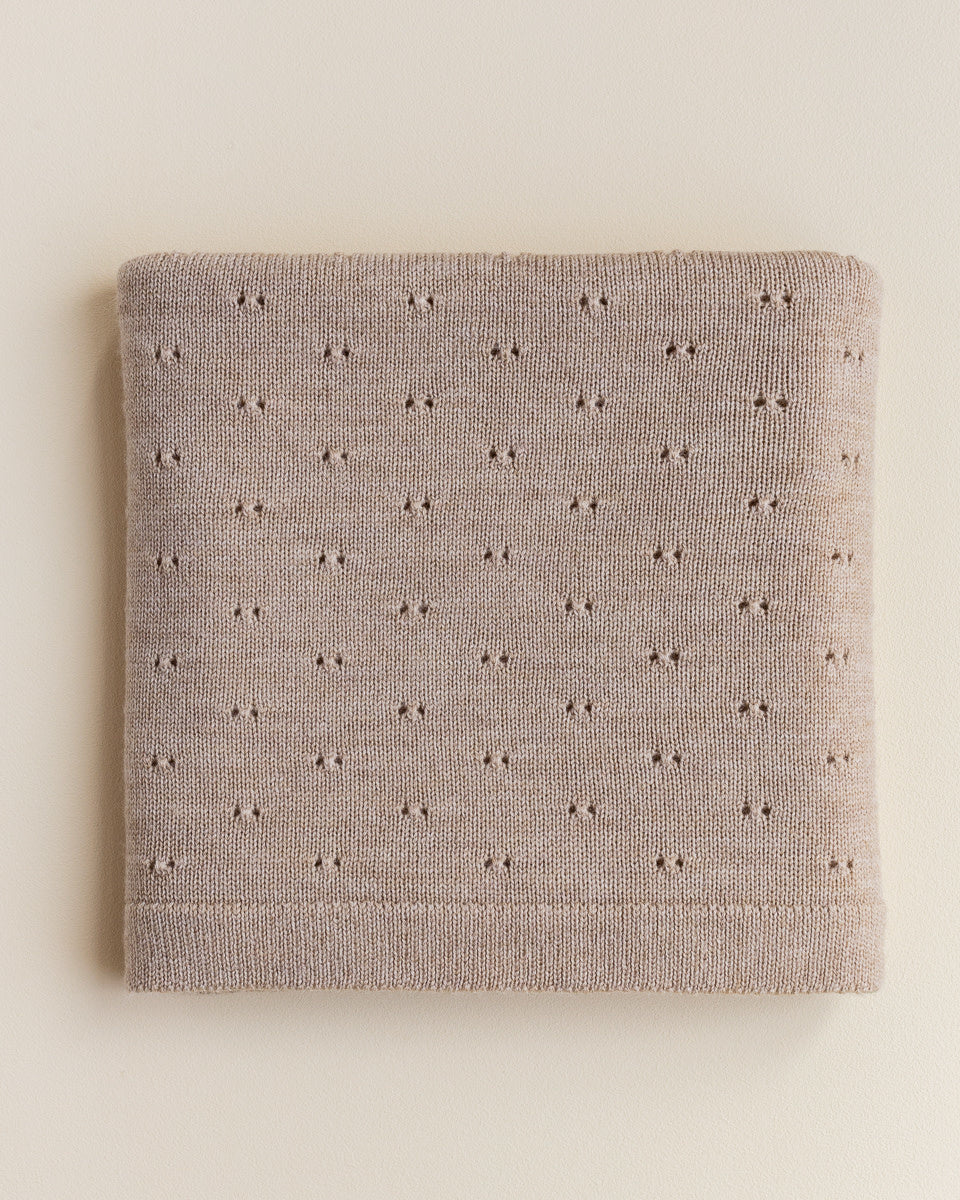 Deken Bibi is een tijdloze ajourdeken gemaakt van zachte, ademende merinowol. Met een medium dikte is het ideaal voor alle seizoenen. Of je nu een extra laagje toevoegt tijdens buitenwandelingen of je baby warm houdt tijdens dutjes binnenshuis, deze veelzijdige deken is perfect voor elke gelegenheid.