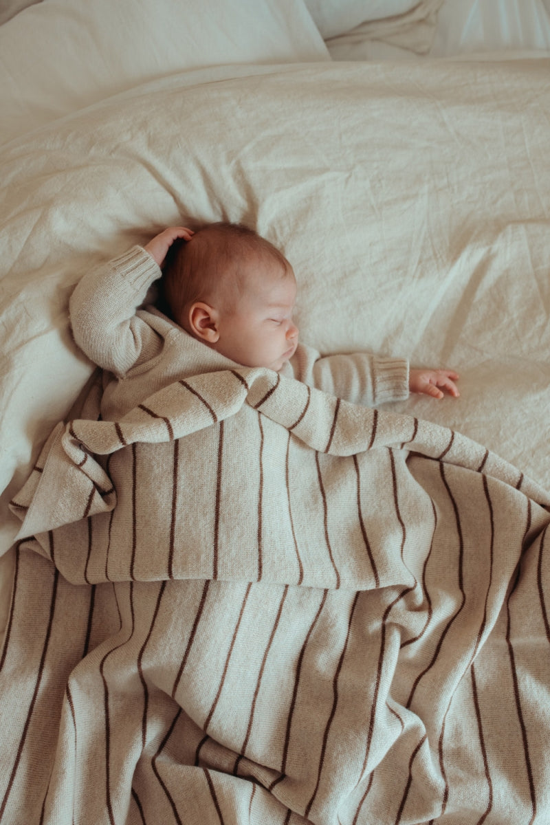Dit zachte wollen deken heeft een medium dikte door het dichte breisel en een subtiele, zachte textuur aan één kant voor extra knusheid. Dankzij de ademende eigenschappen van merinowol blijft het deken comfortabel, ongeacht het seizoen. Ideaal om je kleintje fijn in te wikkelen.