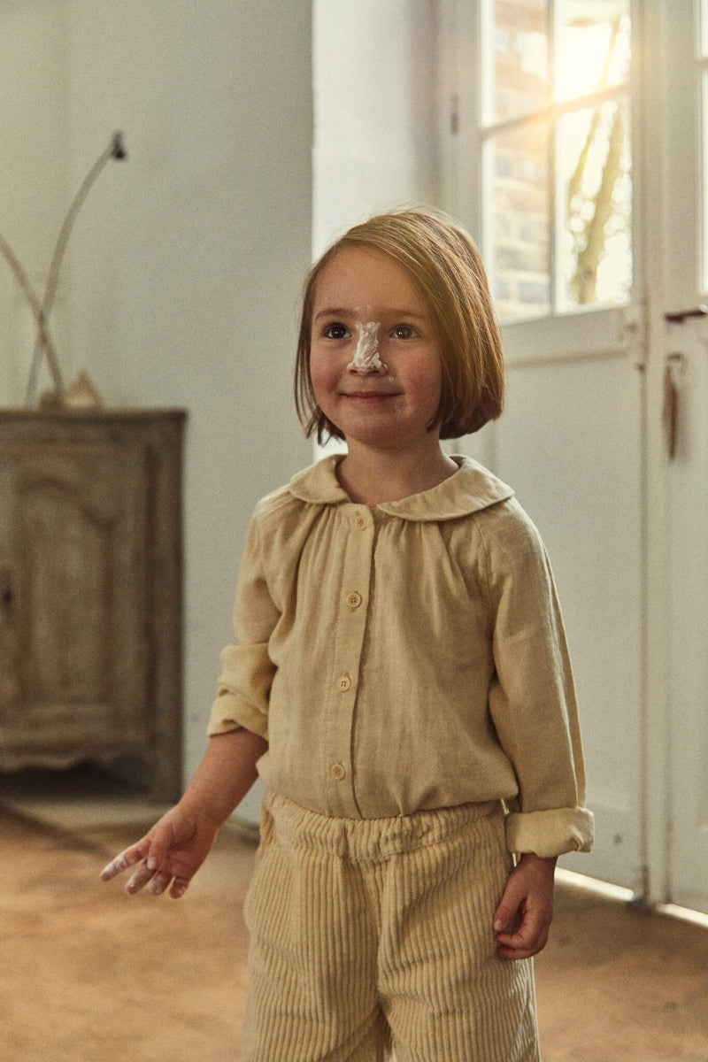 Mooie blouse met grote kraag in warme sand kleur. Leuk in combinatie met de velours biscotti broek van Poudre organic, maar ook heel makkelijk te combineren met een legging of jeans.