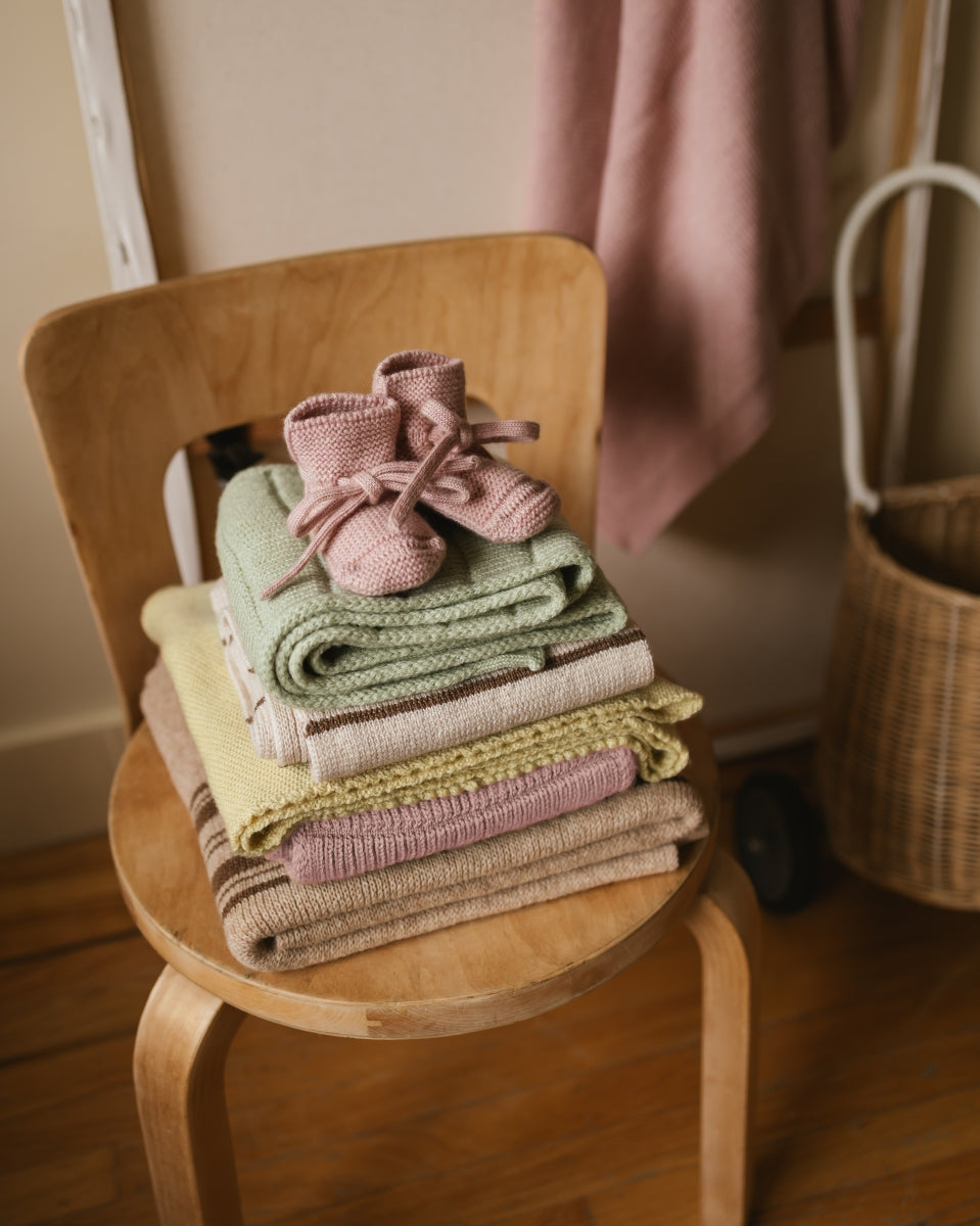 Gemaakt van merinowol, reguleren ze de temperatuur, zodat de voetjes het hele jaar door aangenaam warm blijven. Verpakt in een katoenen zakje, zijn deze sokjes een ideaal cadeau voor elke baby.