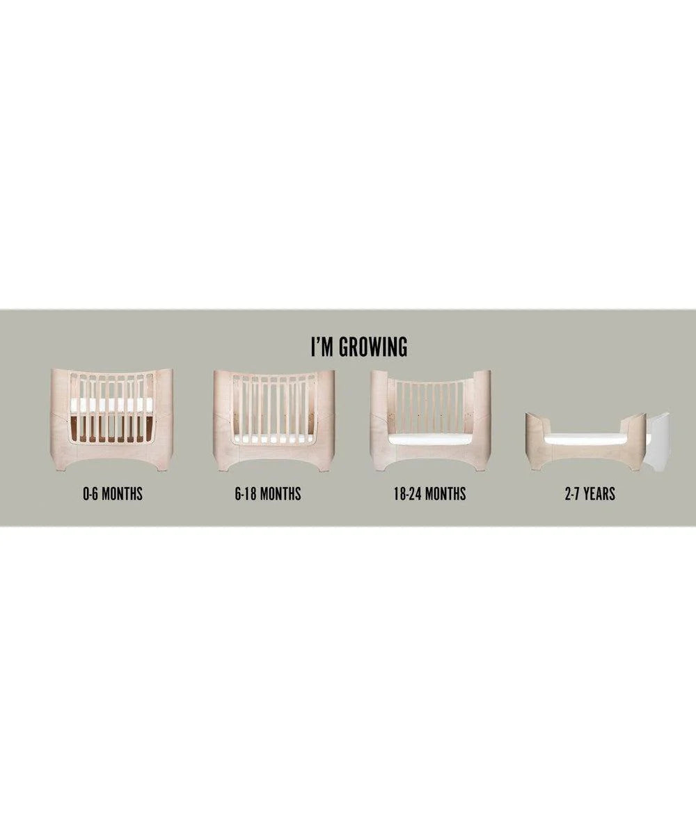 Het bed begint als een hoog babybedje en geeft je kind een veilig en comfortabel plekje om te slapen. Als je kind groter wordt en zich begint recht te trekken, verlaag je de bedbodem. Is je kind er klaar voor om zelf in en uit bed te klimmen? Dan kan je ervoor kiezen om één van de zijwanden weg te laten, en eventueel later ook de andere. Als je de twee zijkanten verwijderd hebt, kunnen ook de hoge voor- en achterkant weggenomen worden. Nu heb je een kinderbed van 70 x 120 cm.