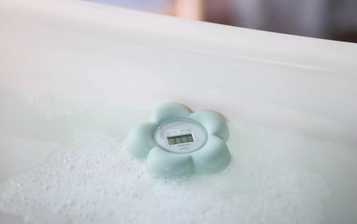 - Gebruik de thermometer om te controleren of het badwater tussen 36,5 °C en 38 °C blijft. Houd de temperatuur lager dan 39 °C voor de veiligheid van je baby.