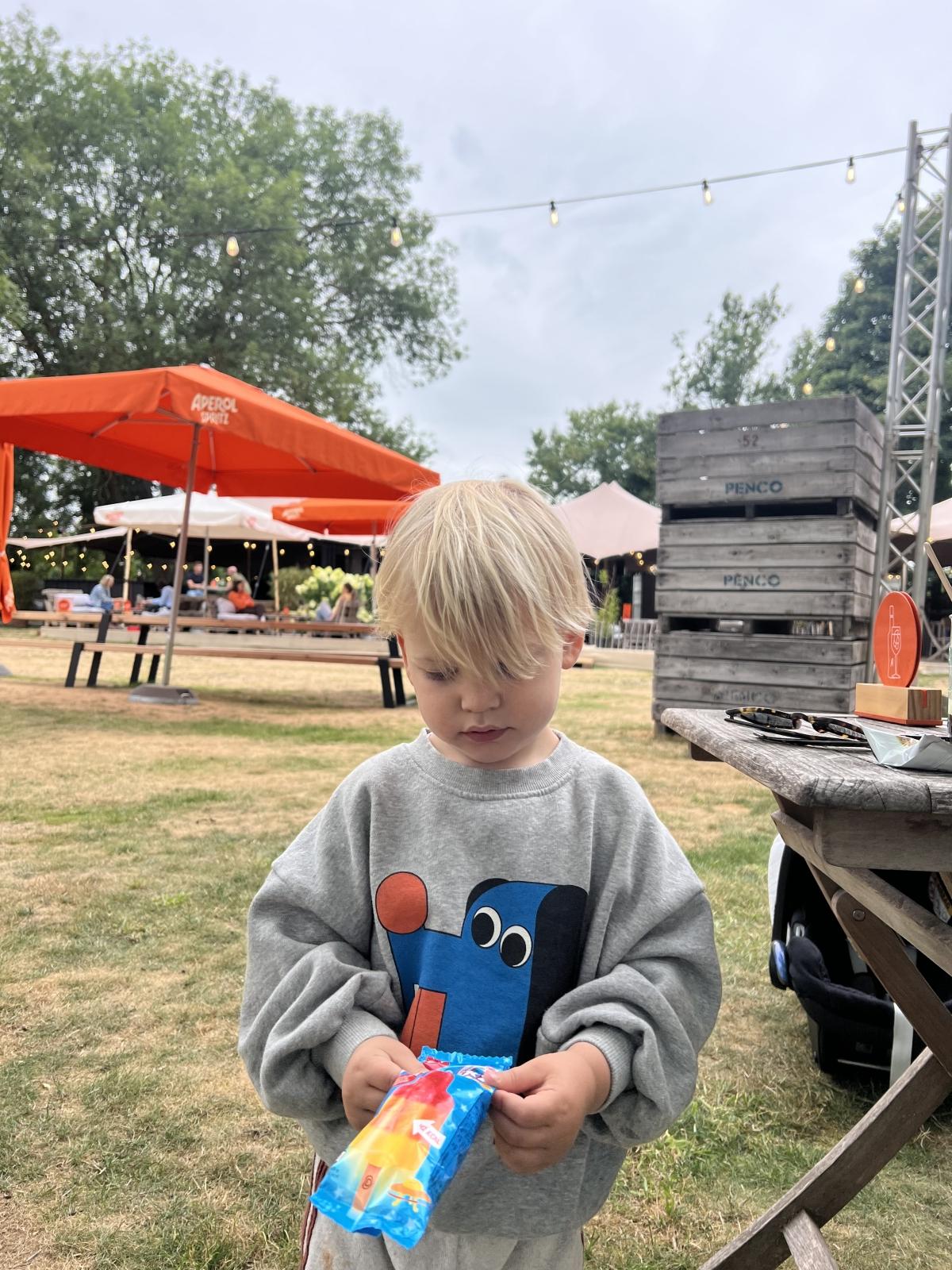 Coole lichtgrijze sweater van Bobo Choses met hond. Het sweatertje heeft een drukknoopsluiting op de schouder en een losse pasvorm. Lekker zacht dankzij het geborstelde fleece aan de binnenkant.