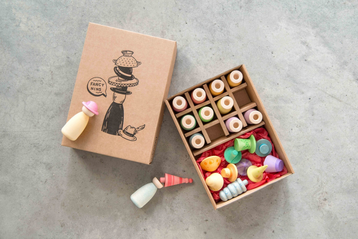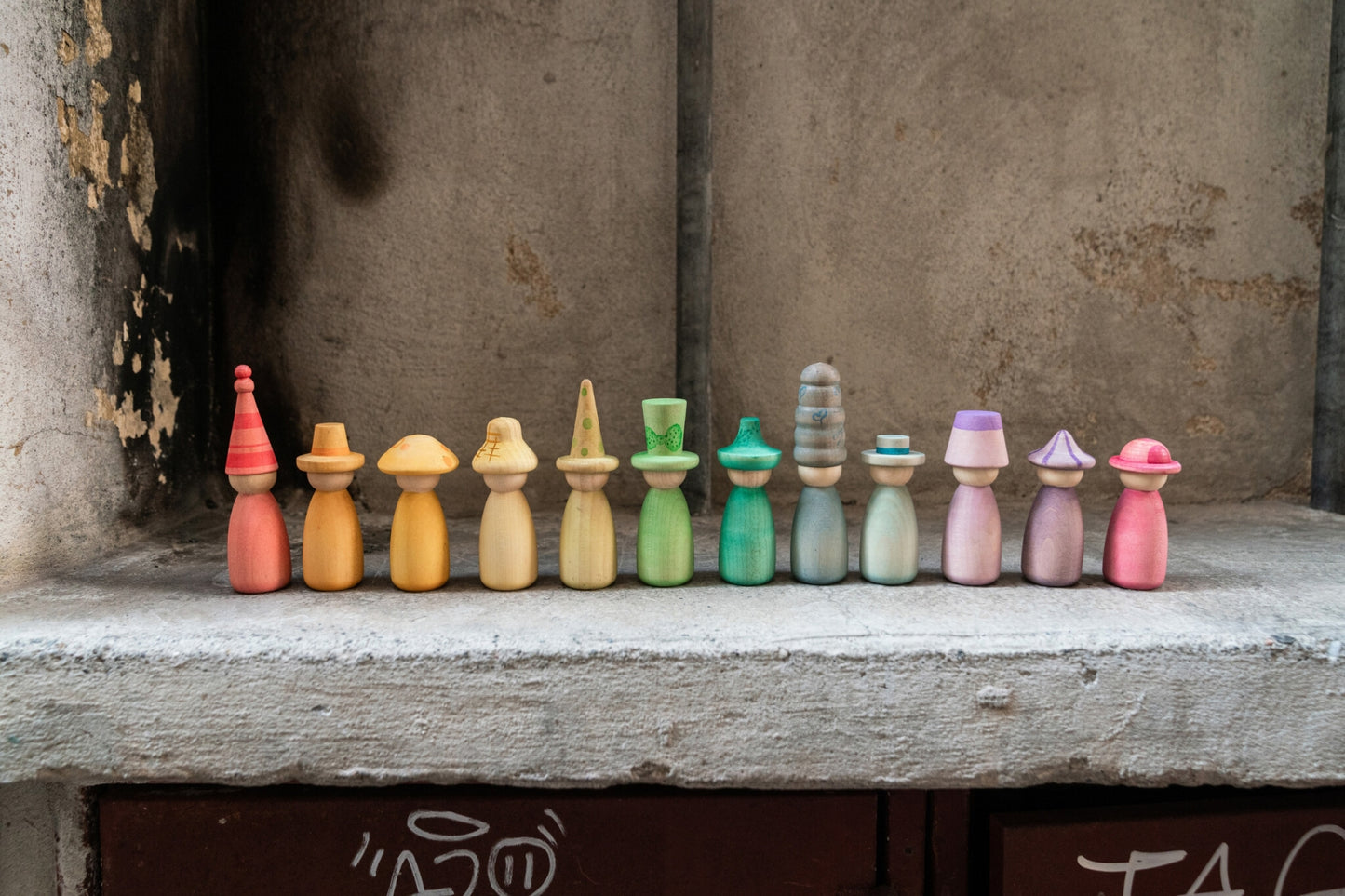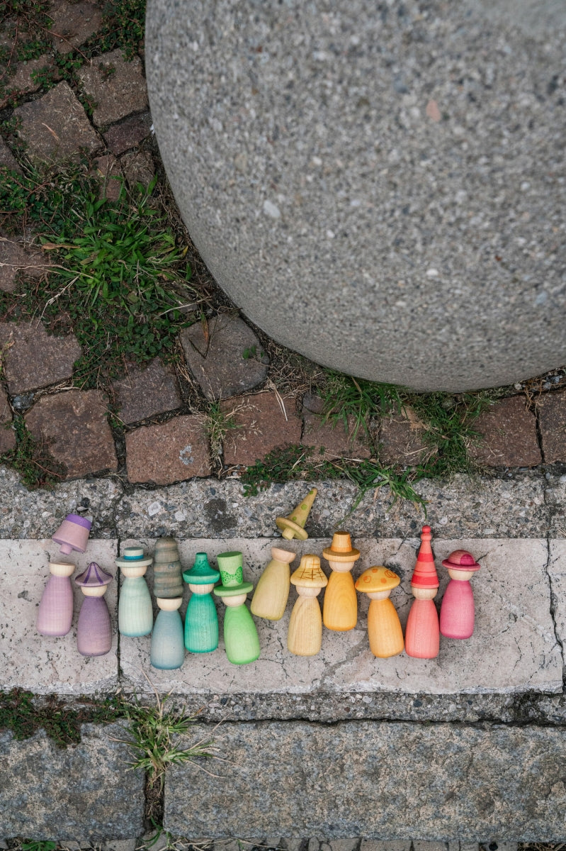 Mooie Grapat-set van 12 flamboyante mannetjes die met de hand zijn gekleurd. En super leuk: ze hebben verwisselbare hoeden!
