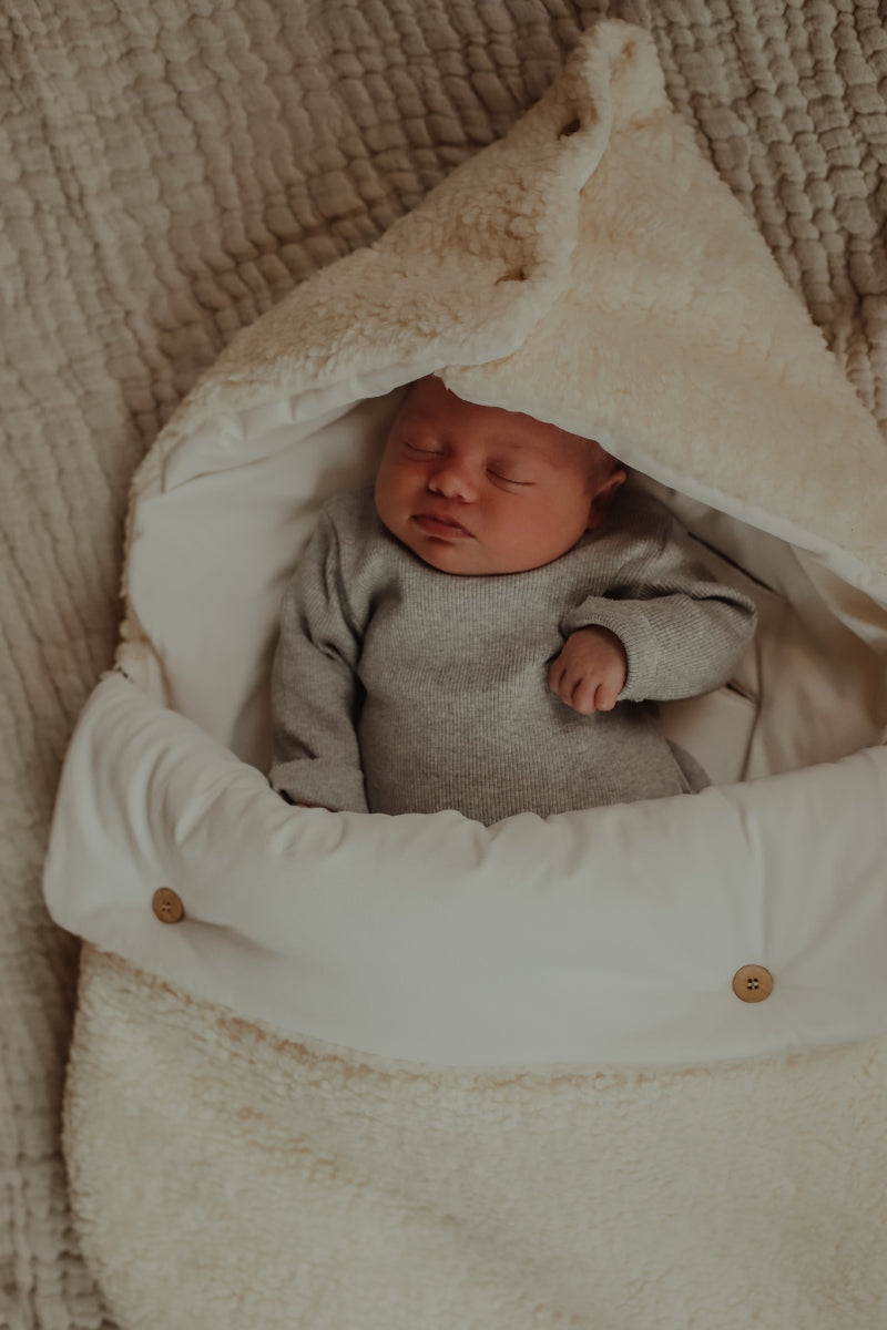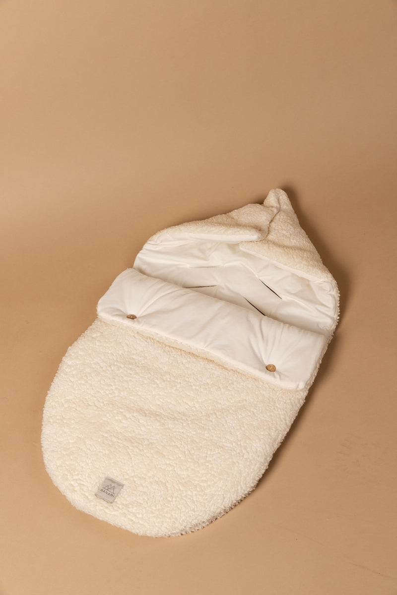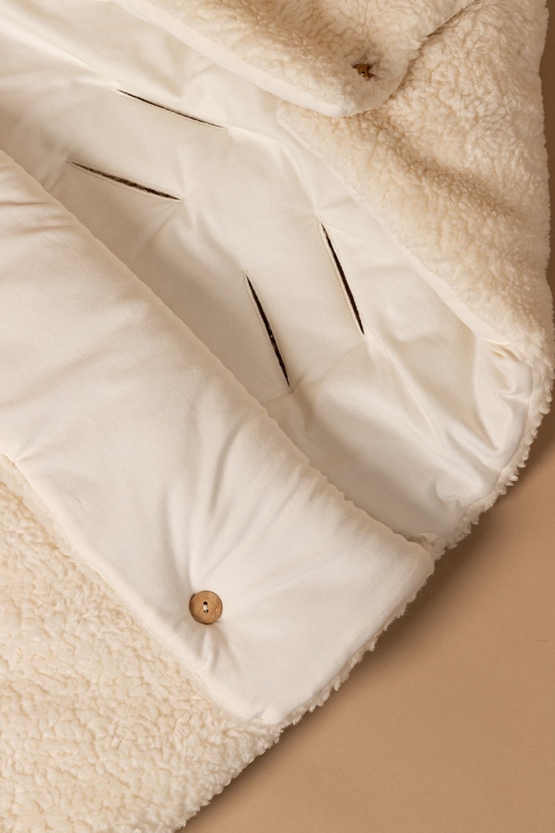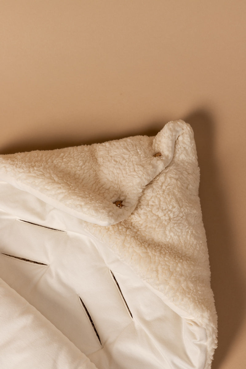 Een heerlijk warme voetenzak van Nanami voor in de maxi cosi met een zachte katoenen tricot binnenkant en een katoen teddy buitenkant .