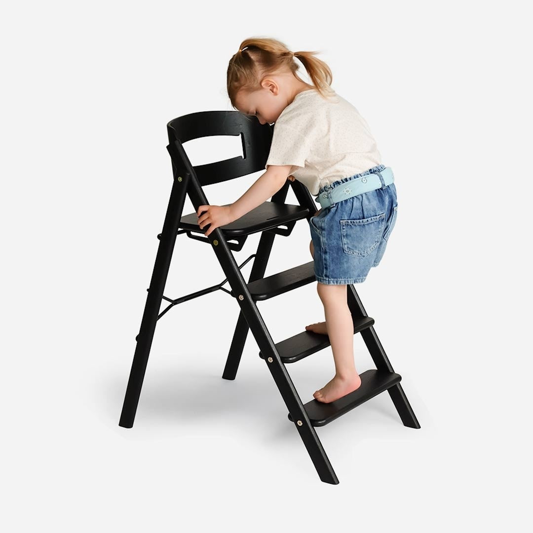 KAOS KLAPP® heeft vaste trapladders die nooit versteld mogen worden. Je mini kan zelf op en van de stoel klimmen, wat al vroeg een groot gevoel van beheersing bevordert. Naarmate je kind groeit, zullen de voeten een natuurlijke, ergonomische positie vinden op verschillende treden, wat te allen tijde een stabiele voetensteun biedt.
