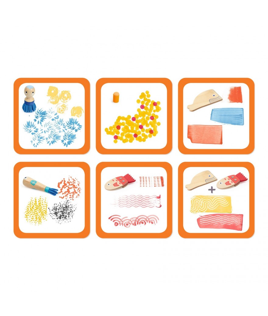 In de doos vind je 6 houten (verschillende) tools, 6 sponsjes (ook verschillende) en 10 instructiekaarten die inspiratie/voorbeelden bieden.