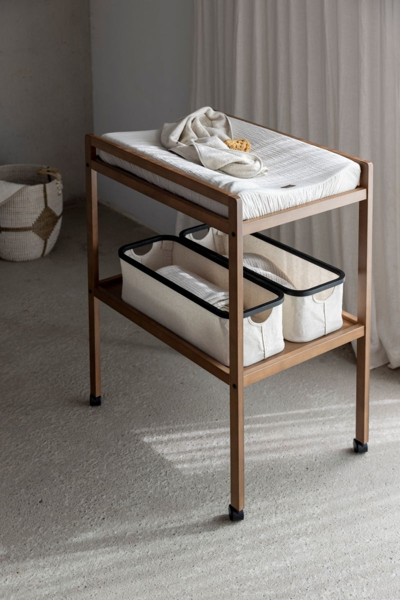 Voor extra opbergruimte biedt de luiertafel optionele (hang)mandjes waarmee je je benodigdheden geordend en binnen handbereik houdt. Deze stijlvolle mandjes voegen niet alleen functionaliteit toe, maar creëren ook een elegante opslagoplossing voor je essentials.