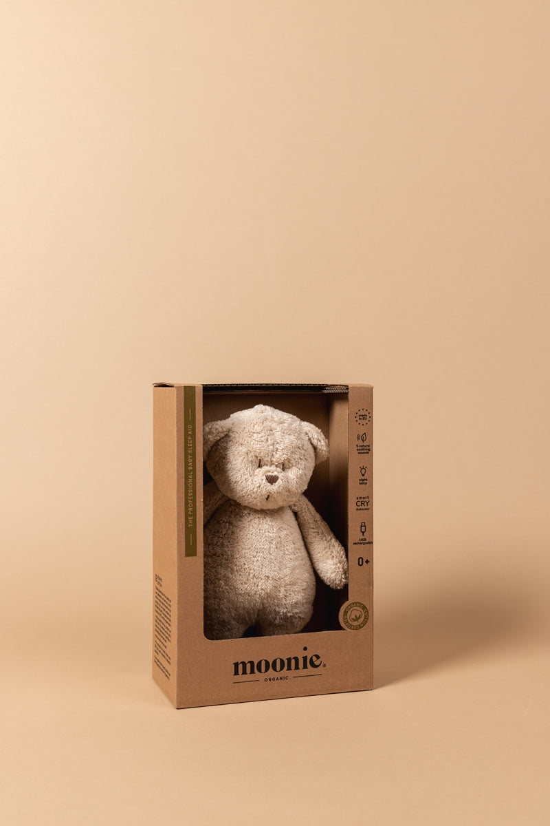 De multifunctionele Moonie knuffel wordt ongetwijfeld de beste vriend van je baby. De knuffel is gemaakt uit zacht organisch katoen en heeft 5 natuurlijke, kalmerende geluiden die een rustige slaap bevorderen en je baby'tje op het gemak stellen.