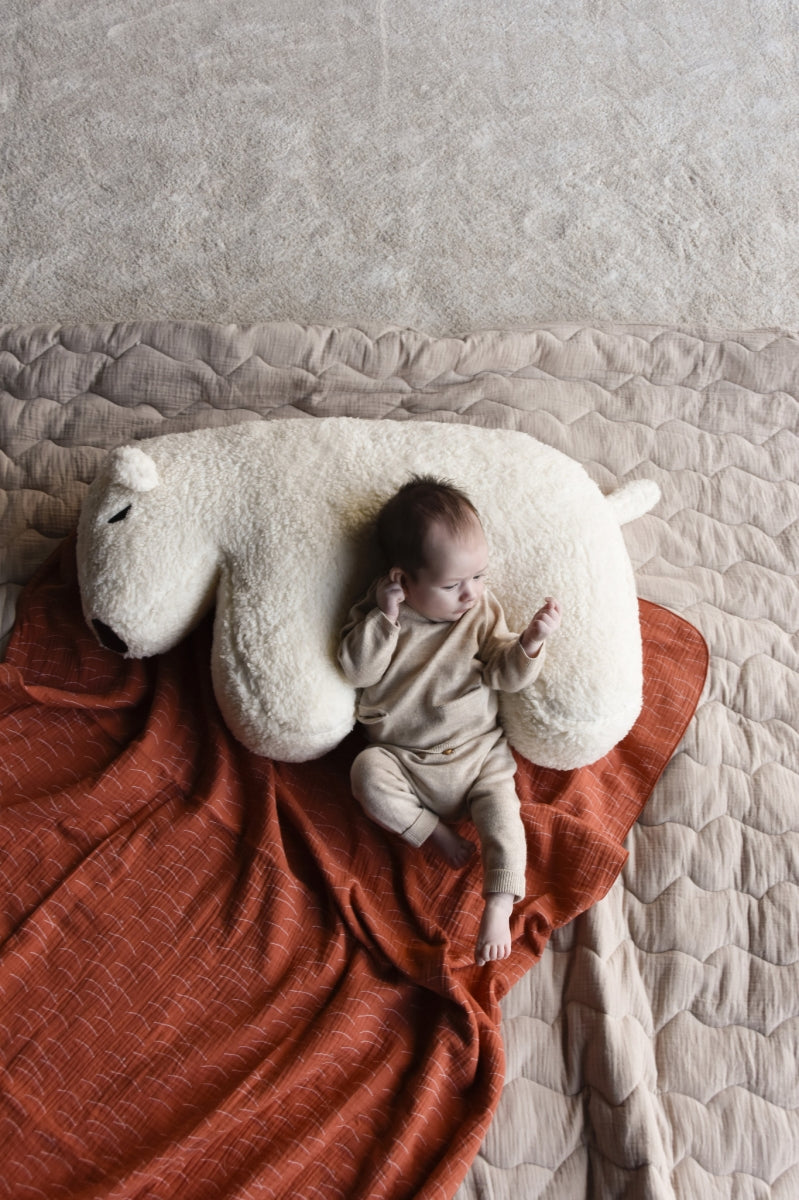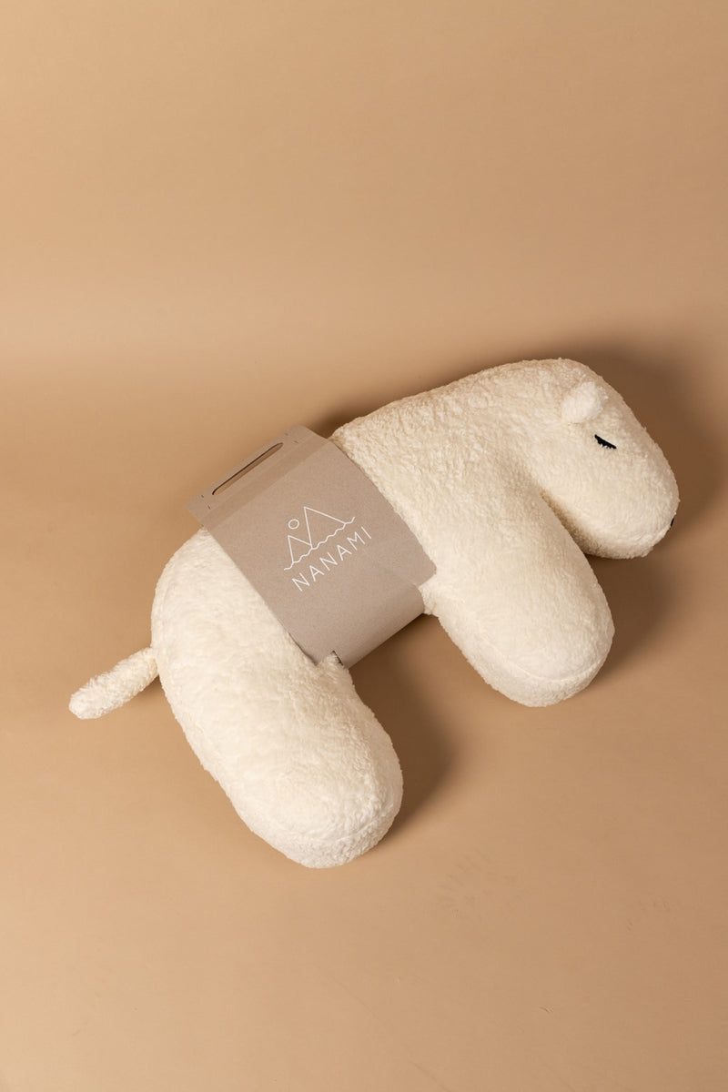Prachtig voedingskussen in zacht teddy katoen in de vorm van een ijsbeer. Multifunctioneel kussen, ook geschikt als relaxkussen en voor ondersteuning tijdens je zwangerschap. Eigenlijk is de ijsbeer al een schitterende accessoire op zich en wordt het al snel het vriendje van je kindje.