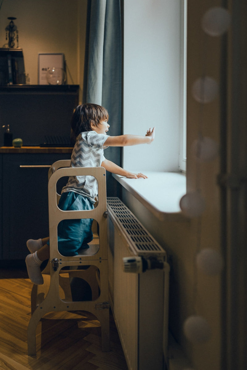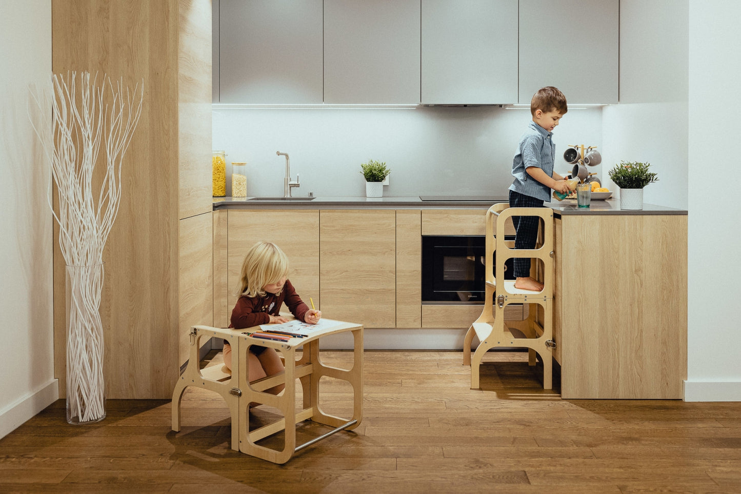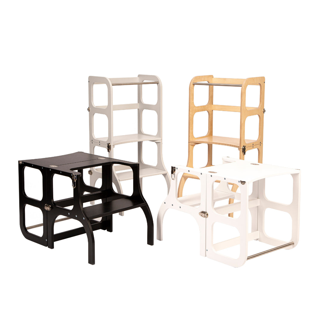 Elk kind heeft de essentie van nieuwsgierigheid in zich! Wat doet mama in de keuken? Misschien heeft papa hulp nodig aan de eettafel? Converteerbare helper toren - tafel is het perfecte meubel voor je nieuwsgierige kleine engel als hij of zij je wil helpen in de keuken, of ergens hoger wil reiken. Step'n'Sit stelt het kind in staat om veilig bij de keukenoppervlakken en de gootsteen te komen om hun handen en fruit te wassen. Je kunt ze ook betrekken bij het koken, zoals het mengen van deeg en het snijden van zacht fruit.