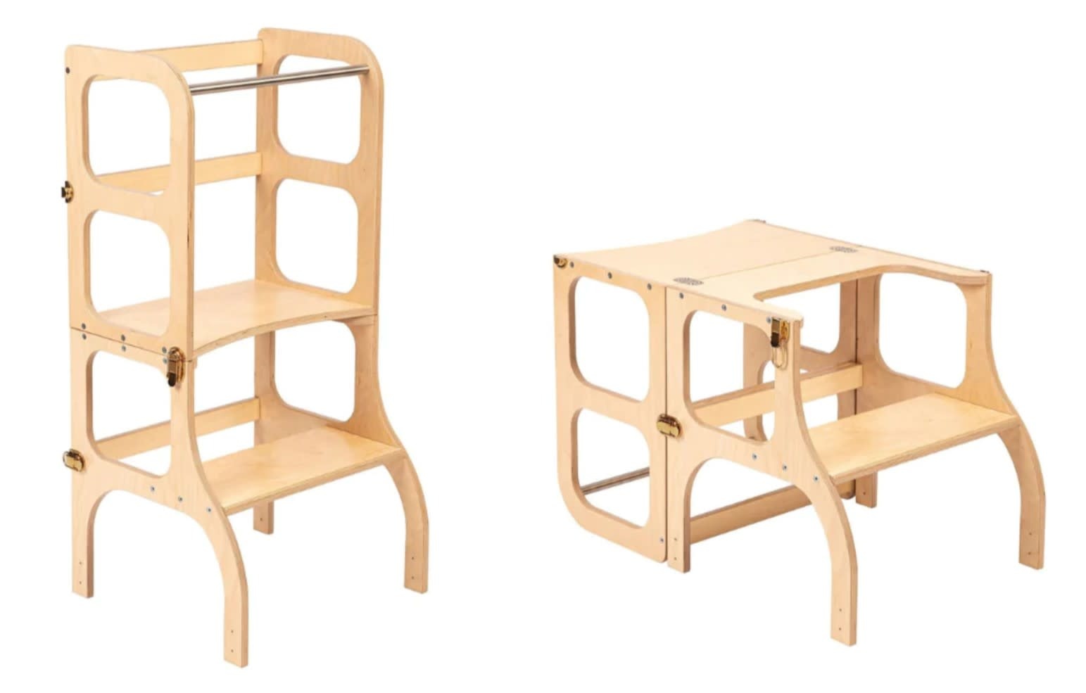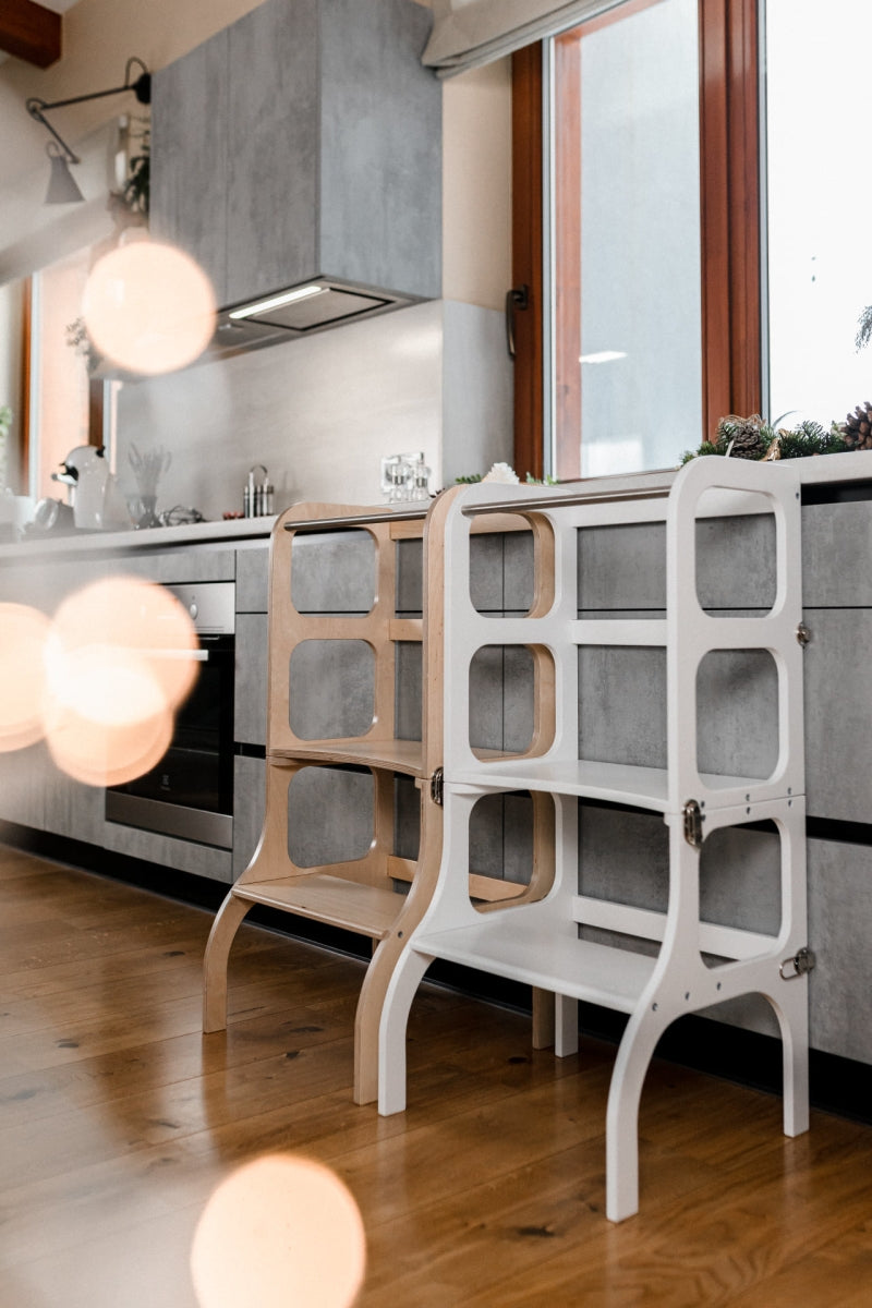 Het ontwerp van de helpertoren is gebaseerd op het basisprincipe van Montessori-pedagogiek voor het ontwikkelen van de onafhankelijkheid en betrokkenheid van een kind bij alledaagse taken. De ombouwbare helpertoren neemt niet veel ruimte in beslag en combineert twee noodzakelijke kindermeubels tot één.
