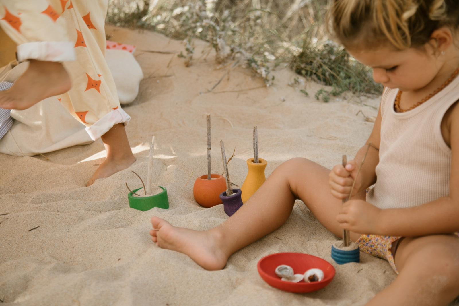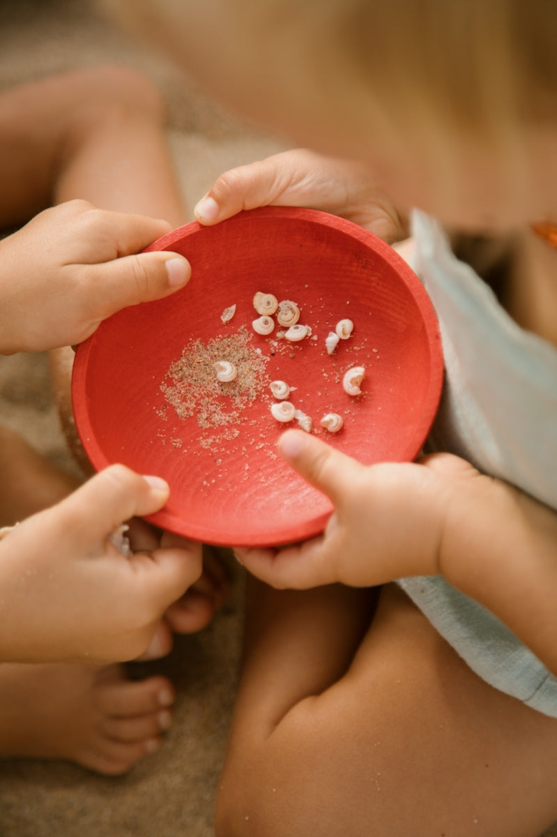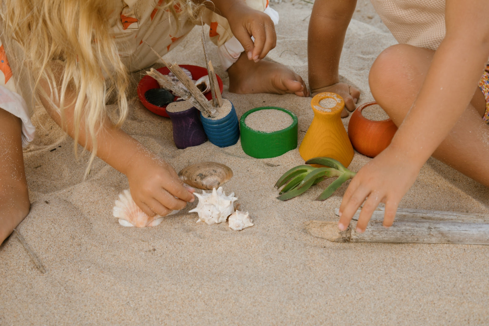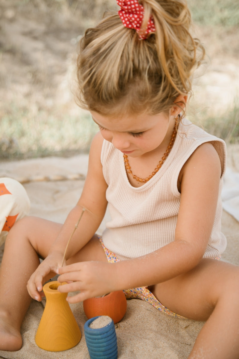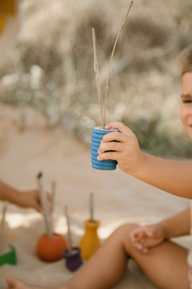 Setje van 6 kleurrijke potjes in verschillede maten, volumes en vormen. Duurzaam & mooi open einde speelgoed waarmee hun fantasie geprikkeld wordt.