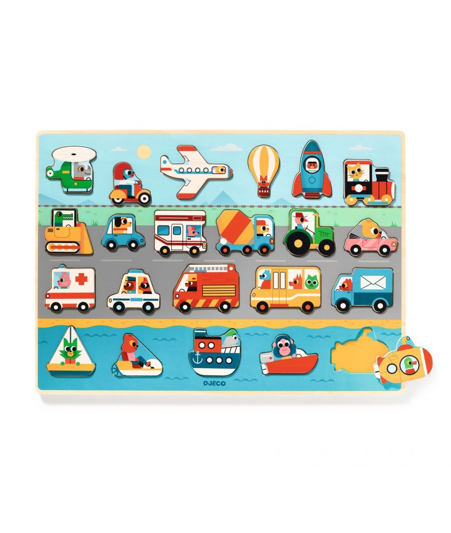 Mooie grote houten puzzel met als thema voertuigen. Je kind plaatst de 22 voertuigen door de afdrukken van de voertuigen op het bord te herkennen.