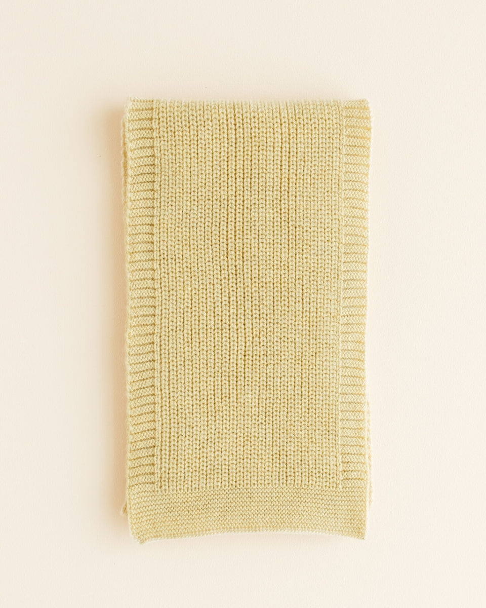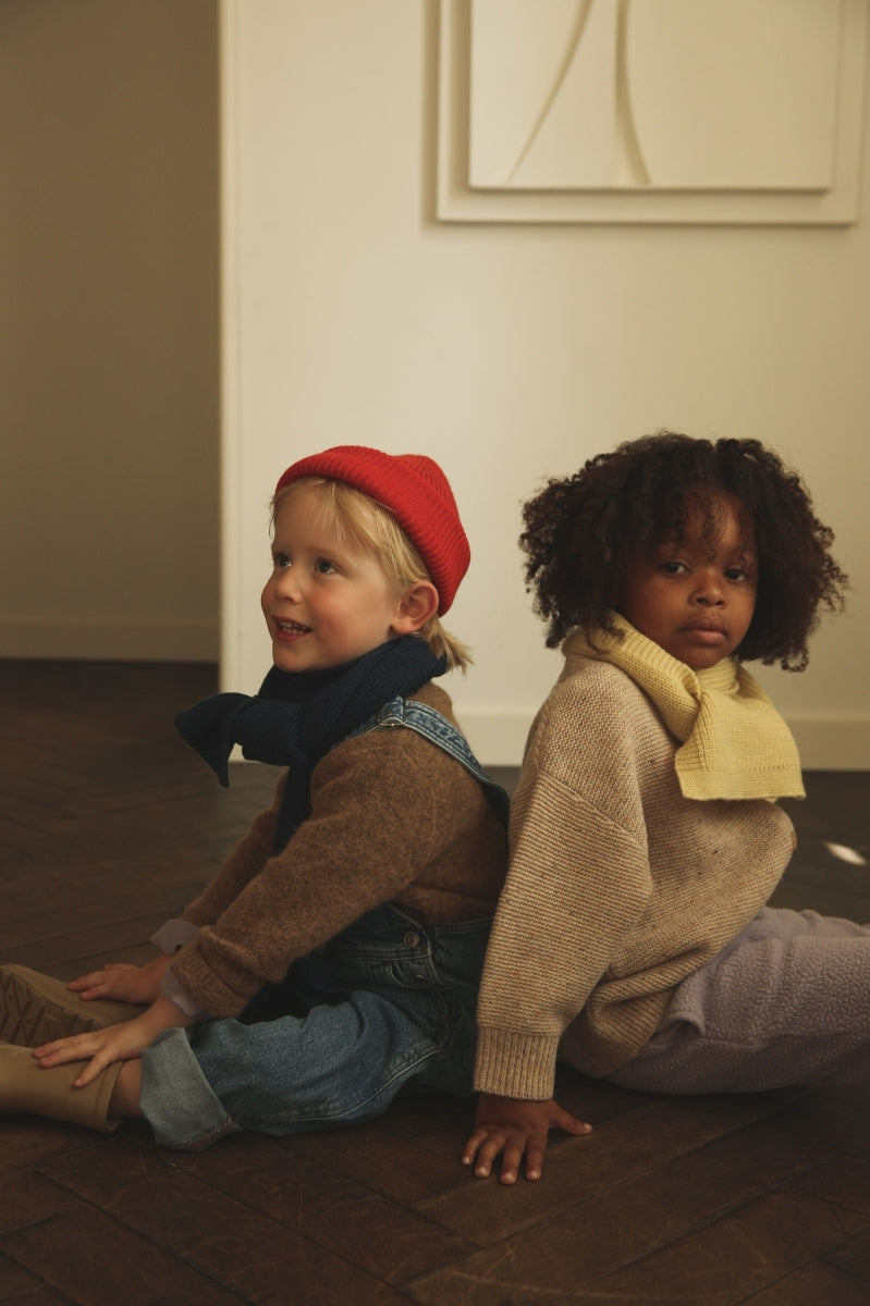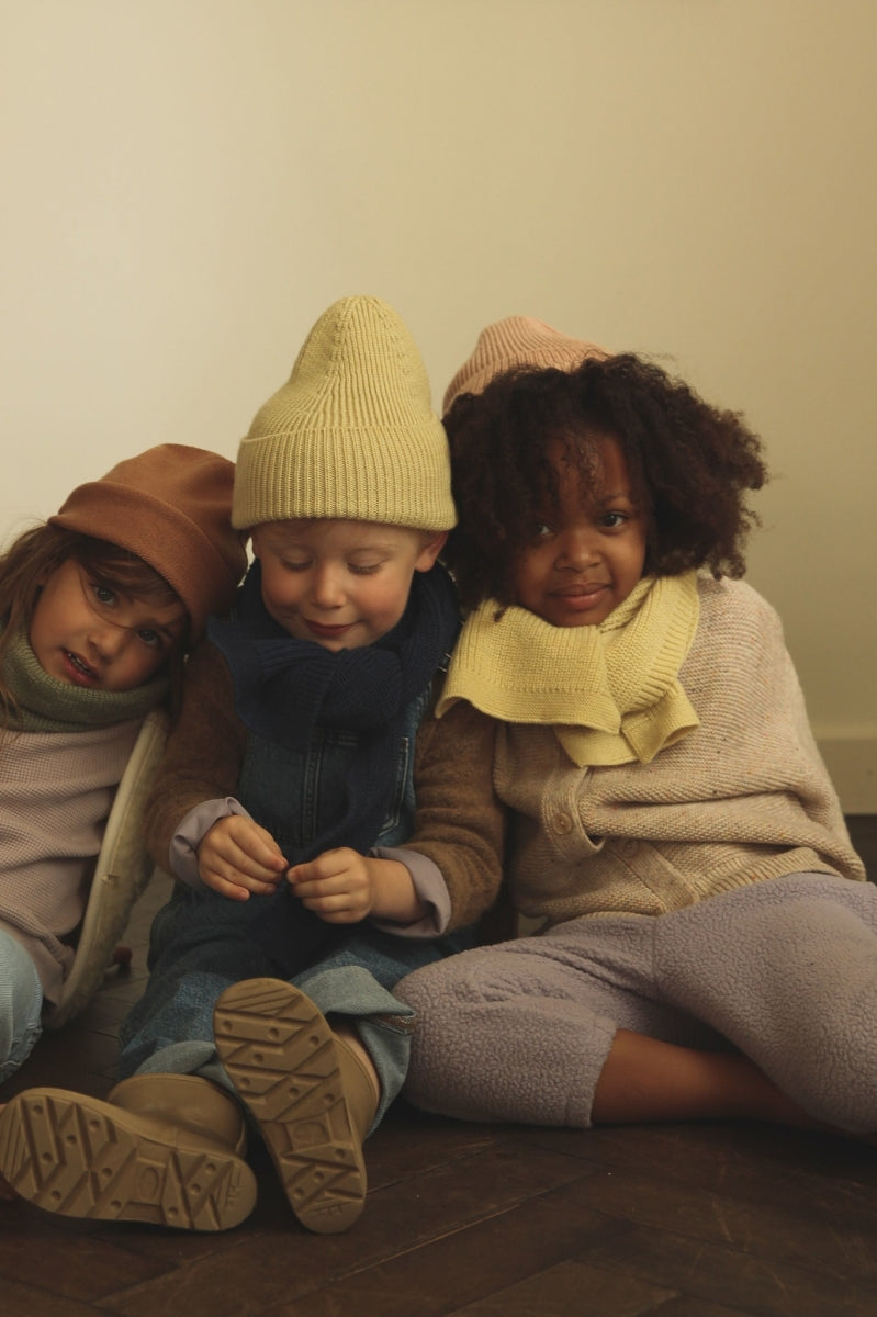 Een sjaal met ribstructuur voor peuters, afgewerkt met een averechtse steek aan de zijkanten en gemaakt van zachte merinowol. Perfect voor de winter om je kleintje heerlijk warm te houden.