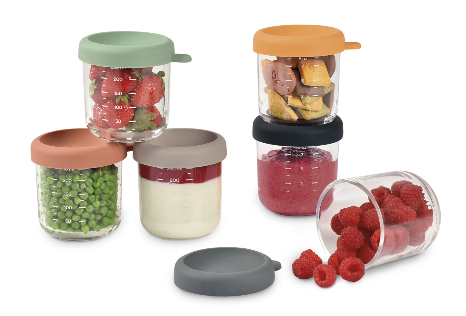 Set van 6 glazen porties van telkens 250 ml, met waterdichte siliconen deksels. Heel handig om extra porties verse voeding in te vriezen of on the go.
