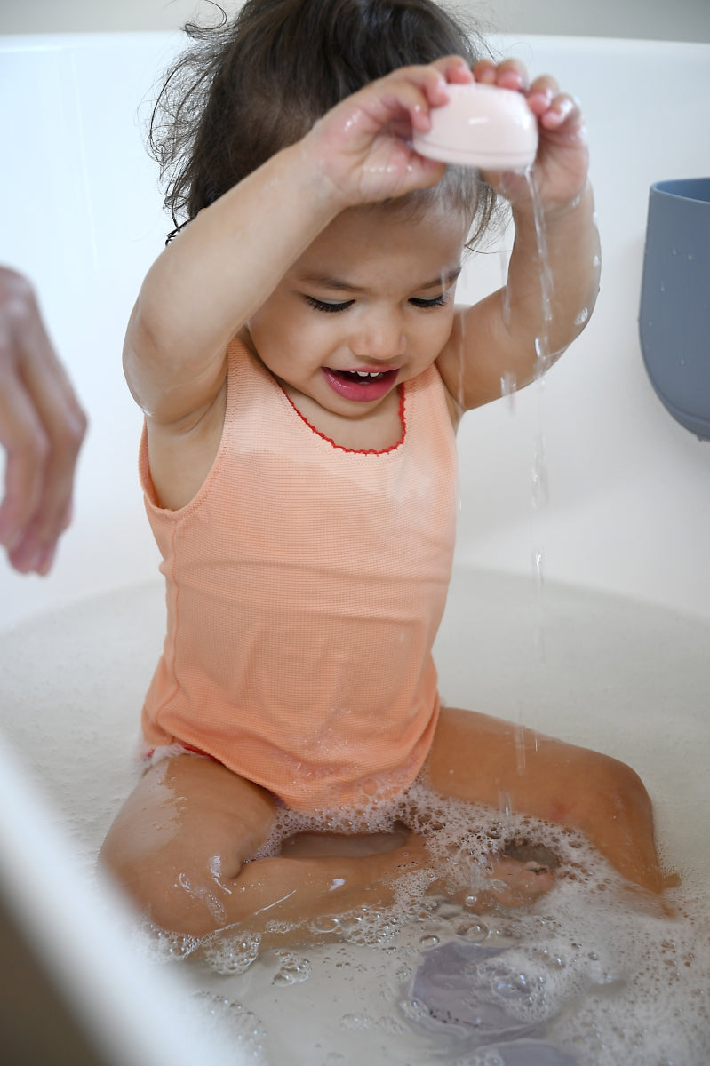 - 4 badspeeltjes: de speeltjes stimuleren de motoriek en ontdekking: stapelbare en nestbare speeltjes met afneembare deksel en met verschillende soorten gaten: om het waterspel te variëren