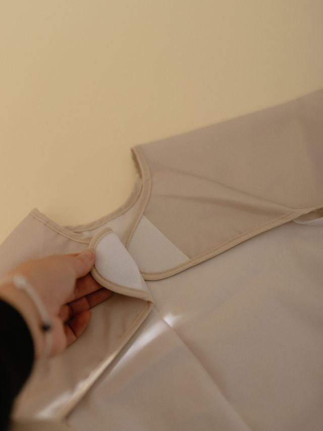 Waterbestendig slabbetje met lange mouwen van Mushie met brede zak om voedsel op te vangen.
