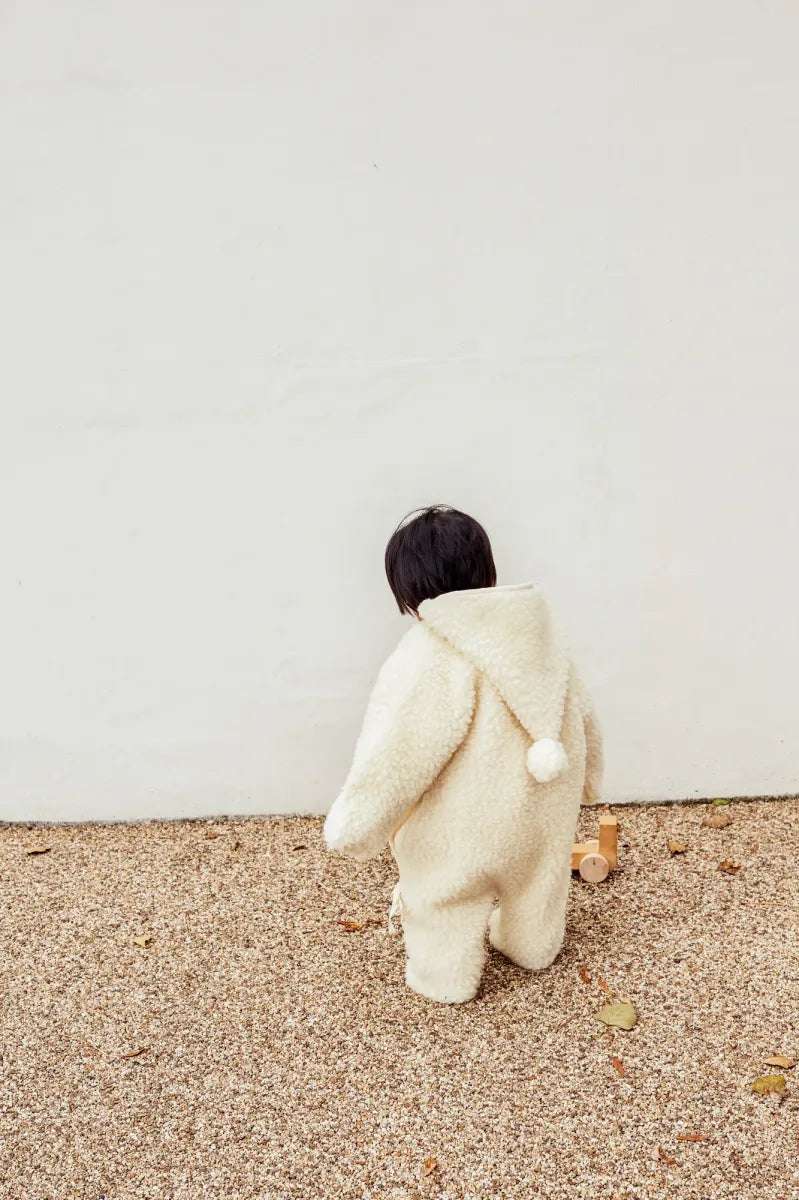 Een prachtige & zachte wollen (100% wol) onesie met houten houthakkersknoopjes aan de zijkant van Binibamba. Een mooi kapje met pompom.