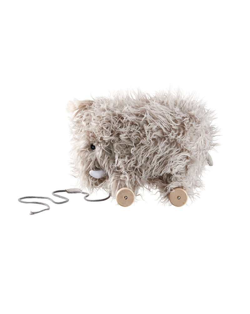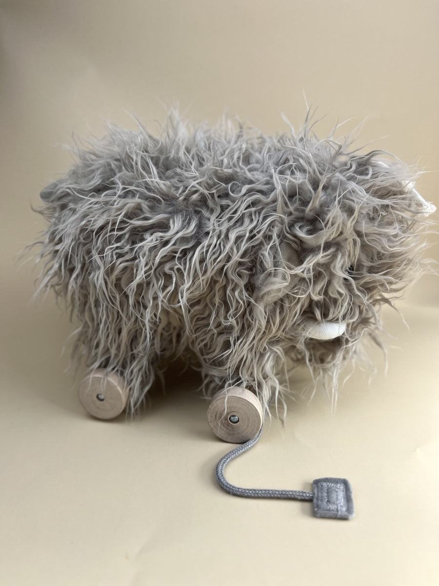 Leuk trekspeeltje met schattige, zachte vacht op houten wielen.