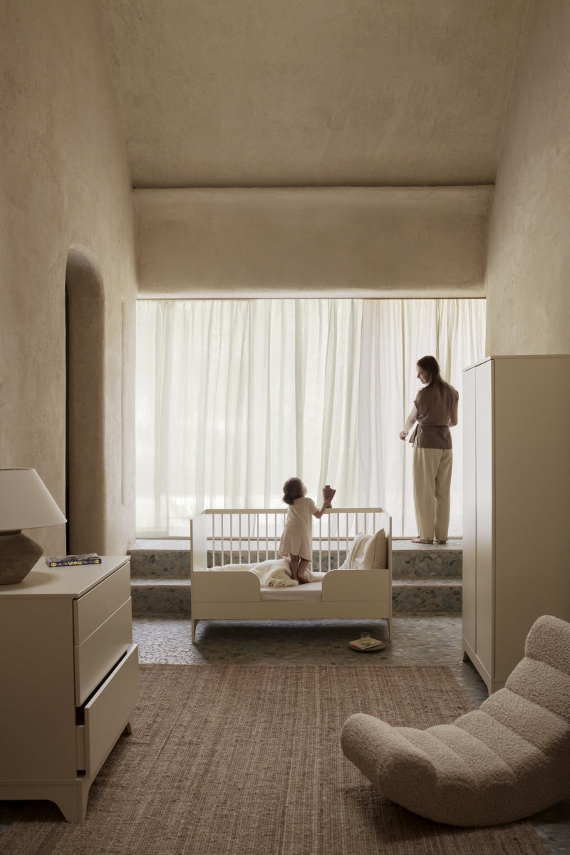 Het groeit moeiteloos mee met de reis van je kleintje: het bed transformeert eenvoudig tot een half-open peuterbedje door één van de spijlerzijdes te vervangen door de inbegrepen uitvalbeschermer. Deze sluit naadloos aan op het ontwerp en biedt extra veiligheid zonder afbreuk te doen aan de lichte, monochrome uitstraling van de Tsugi collectie. Met zijn afgeronde lijnen en tijdloze elegantie brengt dit bed rust en speelsheid in elke kinderkamer. Een design dat meegroeit en perfect past bij de serene sfeer van Tsugi.