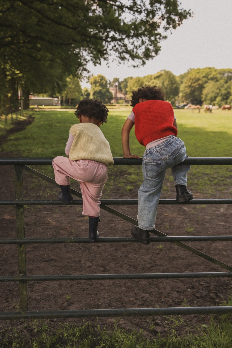 Dit naadloze vest is in één stuk gebreid, wat zorgt voor optimaal comfort voor kinderen. De subtiele elastische draad in de kraag maakt de hals rekbaar bij het aantrekken en sluit daarna mooi aan. De fisherman’s rib geeft het vest een heerlijk zachte textuur. Dit model heeft een rondere pasvorm dan de babyversie en een bredere ribband aan de onderkant, wat zorgt voor een baggy look.
