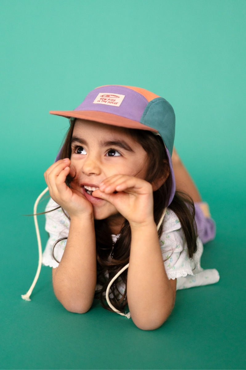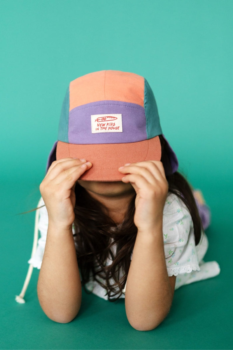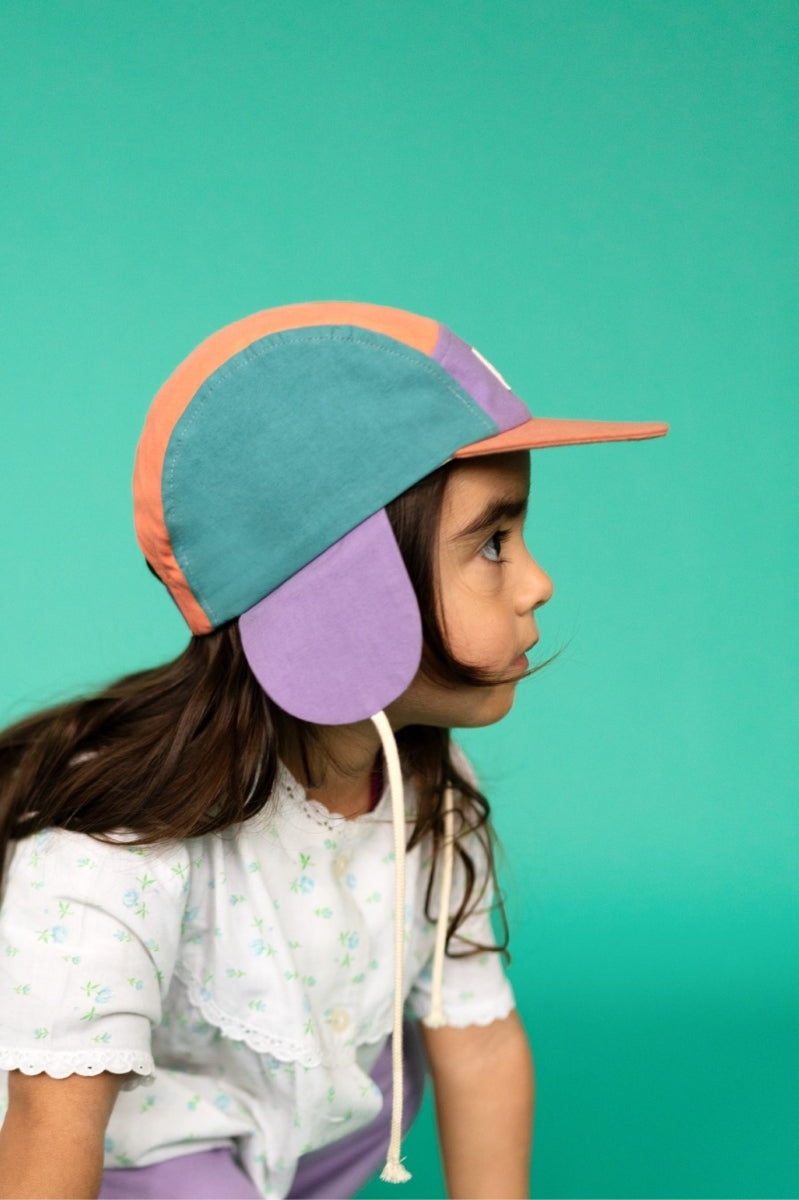 Handgemaakte pet met oorkleppen en een elastiek aan de achterkant, volledig gemaakt van gerecycleerd katoen (van bedlinnen) in Duitsland.